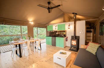 For at gøre oplevelse endnu mere speciel, er glamping-teltene nu i et nyt design, der maksimerer den fantastiske udsigt. Nyd de storslåede omgivelser fra din store L-formede træterrasse, og oplev naturen helt tæt på med de fem justerbare canvaspaneler, der åbner op til landskabet. Selvfølgelig har vi bevaret de klassiske AfriCamps-fordele – indendørs pejs, bløde senge, udendørs braai og din egen private træfyrede hot tub under åben himmel.